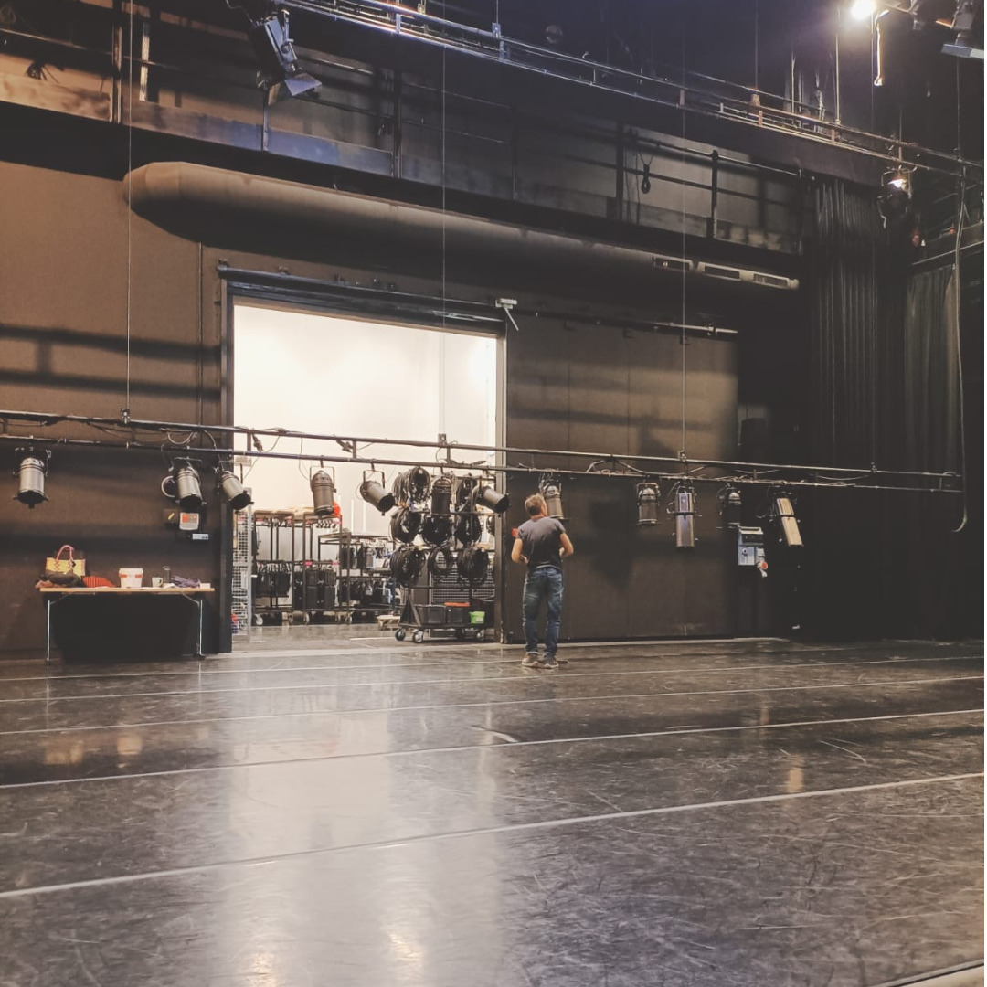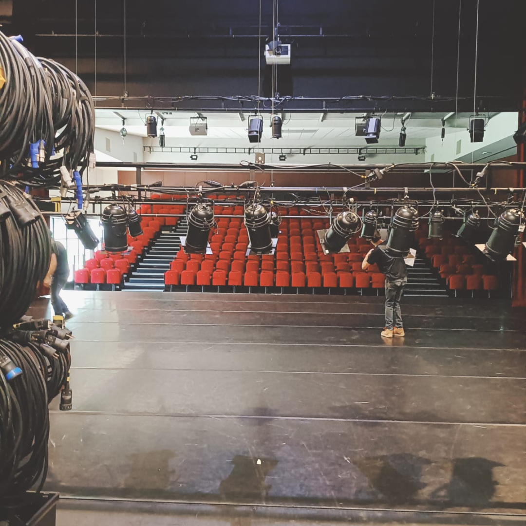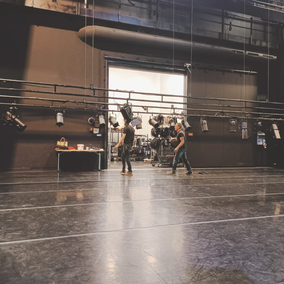 À J-2, place à la préparation : accroche des projecteurs, installation du “plan de feu”… les techniciens suivent pas à pas la fiche technique envoyée par la compagnie pour donner vie au spectacle.