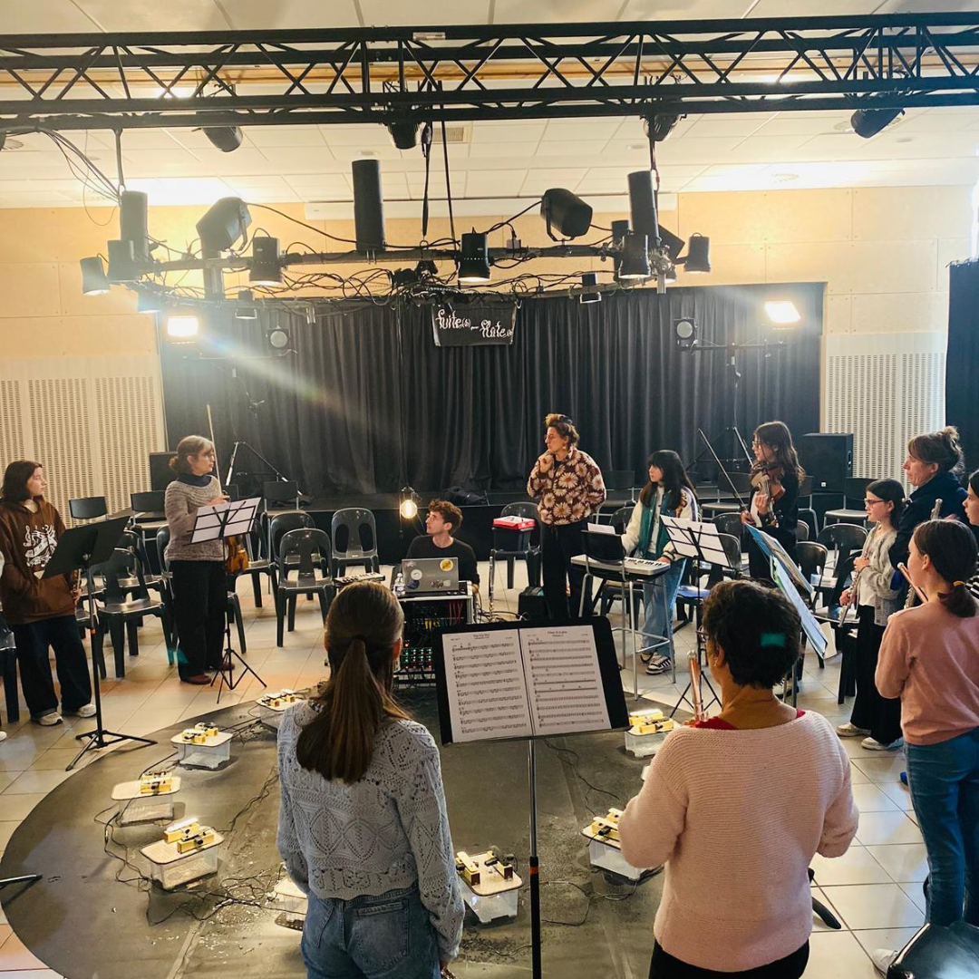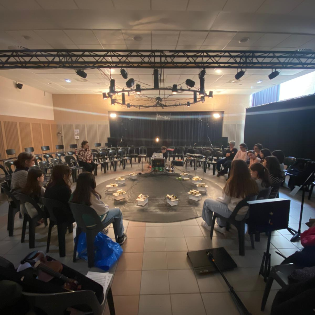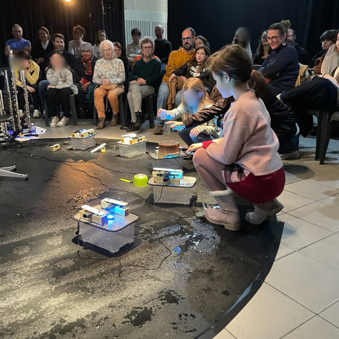 En lien avec le spectacle Fuite(s) pour Flûte(s), les participant·es ont découvert le dispositif musical basé sur la chute de gouttes d’eau. Après la présentation d’un extrait du spectacle et l’explication du mécanisme, chacun·e a expérimenté le dispositif grâce à un clavier MIDI déclenchant la chute des gouttes sur les lames sonores.