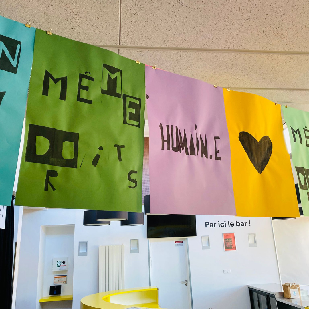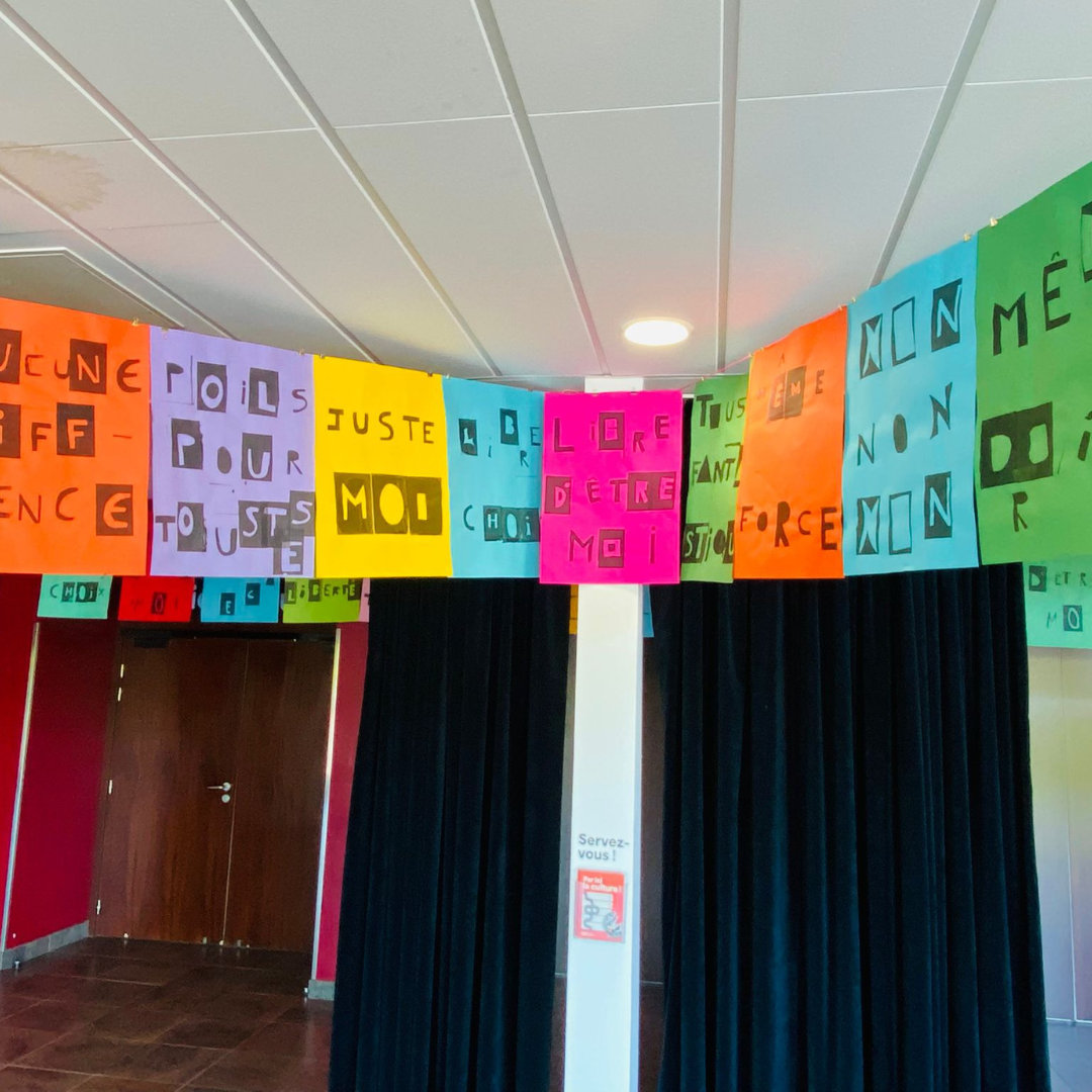 Après un atelier de sérigraphie mené en janvier avec l’artiste Margot Bürki autour des questions de genre, d’identité et de clichés, les élèves de CM1 et CM2 de l’école Saint-Joseph de Saint-Hilaire-de-Clisson ont eu la fierté de voir leurs affiches exposées dans le hall du Quatrain lors des représentations du spectacle.